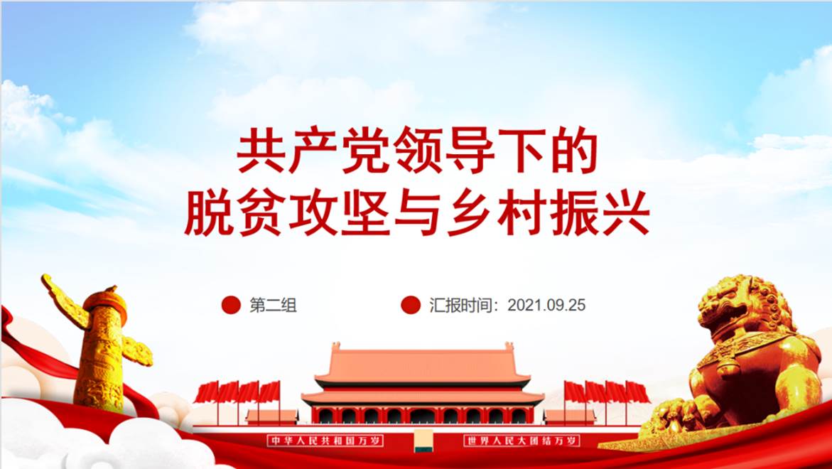 首先,黄玉兰同志认真解读了全国脱贫攻坚总结表彰大会,脱贫攻坚取得的重大历史性成就,实现了农村贫困人口全部脱贫、脱贫地区经济快速发展,同时也标志着我国脱贫攻坚战取得了全面胜利。然后王召杰同志从产业振兴、人才振兴、文化振兴、生态振兴、组织振兴五个方面对于乡村振兴整体布局进行分析,认为全方位的振兴才能真正带动乡村。接着苟国平同志从人才振兴和加强农业基础设施薄弱环节建设两个方面进行了更加详细的剖析。最后该小组总结道:从脱贫攻坚转向乡村振兴,既反映了中国共产党在新时期“三农”工作取得的重大成就,也反映了中国共产党领导的独特优势和社会主义制度的优越性。在中国共产党成立100周年之际,开展对脱贫攻坚和乡村振兴的学习研讨对于同志们了解中国的具体国情和经济政策、认识中国共产党的领导优势和社会主义制度的优越性有着重要意义。