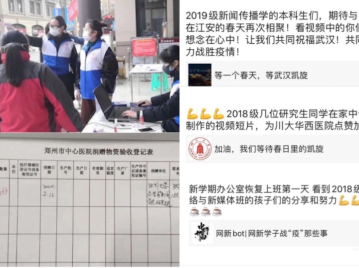 疫情爆发以来,澳门网投官网不少同学通过多种方式,志愿参与抗疫服务,传递温暖。2019级100余名硕士研究生自发筹款,为前线医务工作者募集133副护目镜,由张宇轩为前线医务工作者送去护目镜。2017级新闻学专业本科生张恩铭同学主动报名家乡发起的“关爱抗疫医护人员子女志愿辅导团”,为一位父亲正奋战在南充抗疫一线的高三男孩进行线上学习辅导,主动关心对方情况。2017级网络与新媒体专业本科生王小翠报名参与“雷火救援志愿者”,协助打通救援的信息通道。