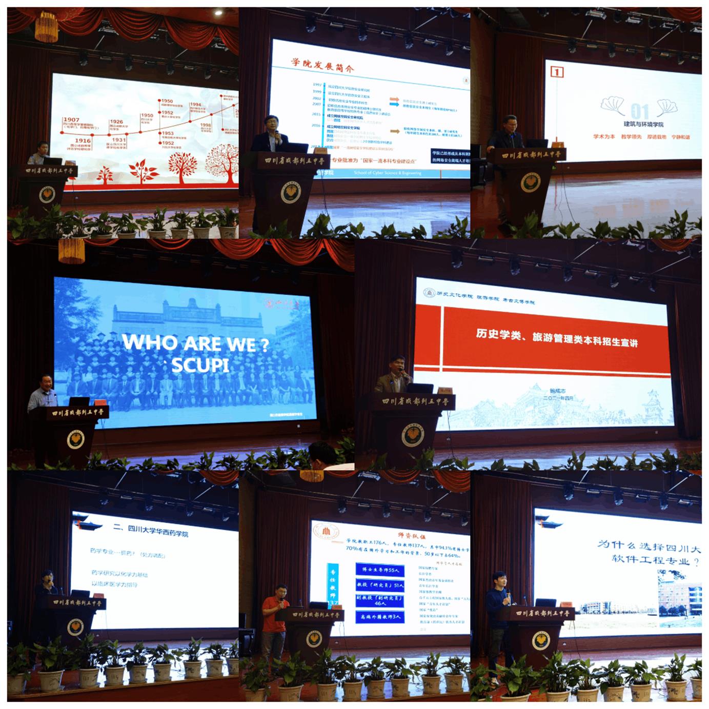 为增进我校与省内重点高中的交流合作,吸引更多优质生源报考我校,4月22日,澳门网投官方网站招生宣讲团来到四川省列五中学开展招生宣讲。本次宣讲团由澳门网投官方网站发起组织,包括了澳门网投官方网站招生办公室副主任廖爱民、澳门网投官方网站副院长周维东教授、网络空间安全学院副院长杨频教授、软件学院软件工程系主任张意教授,建筑与环境学院副院长兰中仁副教授、生命科学学院生物技术系主任赵建教授、历史文化(旅游)学院副院长鲍成志教授,药学院周乃彤副教授、化学学院副院长郑成斌教授、匹兹堡学院麦诚志教授、华西口腔医学院张倩倩老师等一行15人。