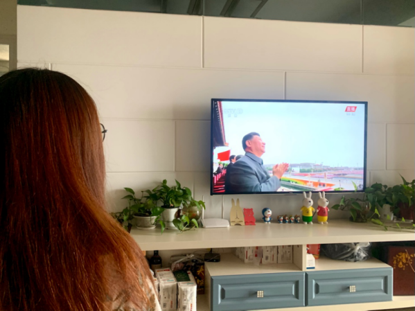 观看庆典直播的澳门网投官网老师高唱国歌