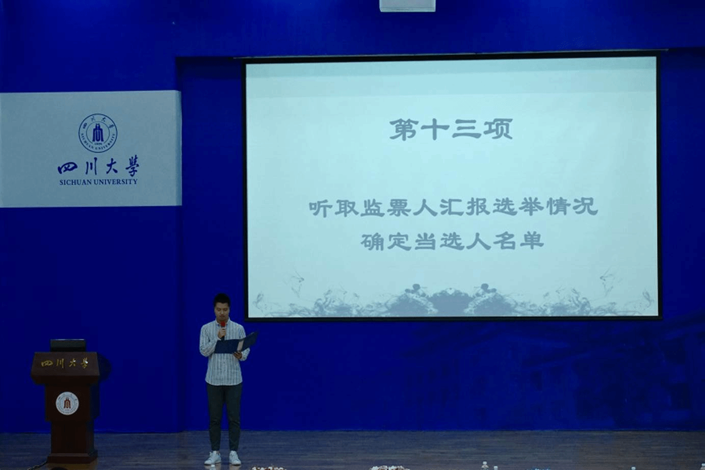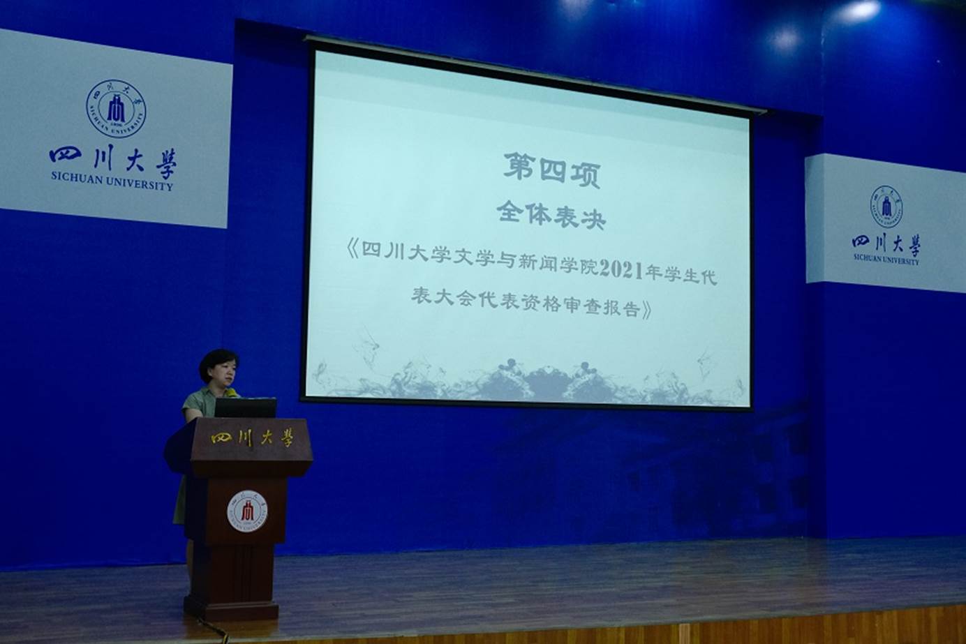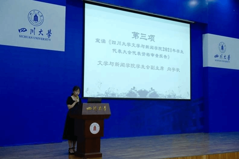 7月4日下午,我校第三十三次学生代表大会澳门网投官方网站分选区2021年学生代表大会在江安校区水上报告厅顺利召开。澳门网投官网党委副书记兼纪委书记张莹老师、院团委书记王志华老师、2020级本科生辅导员胡余龙老师、2020-2021届研究生团总支、研究生会负责人朱嘉诚等嘉宾出席大会。澳门网投官网2020-2021届团委学生副书记陈天麟、2020-2021届学生会主席石秦一,副主席向宇歌、伊靳涛,2021-2022届团委学生副书记郑钰科,主席团候选人张小艾、谷明珊、康雨晨以及160名学生代表参加大会。