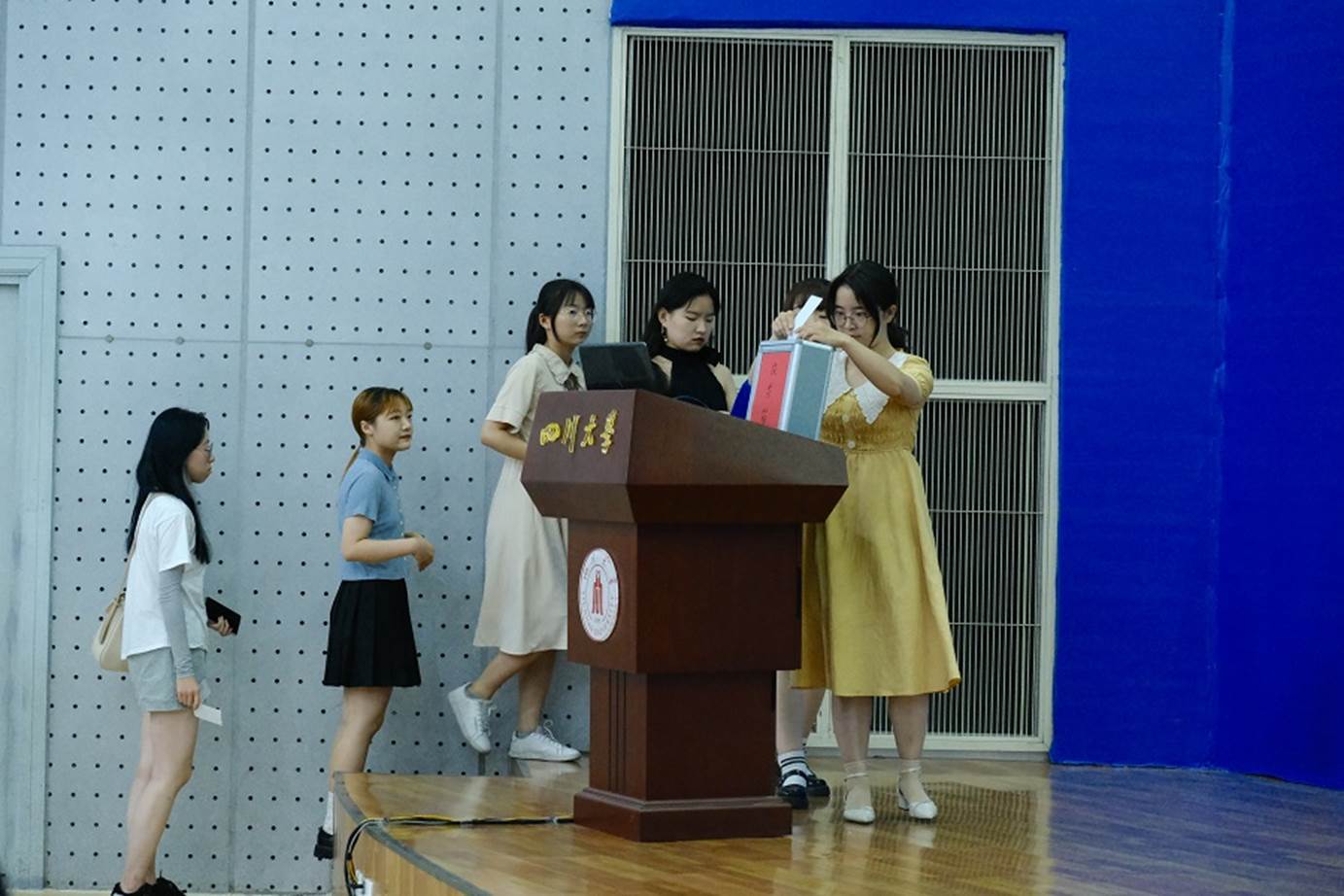 接下来,主持人介绍了澳门网投官网学生代表情况,并由2020-2021届团委学生副书记陈天麟进行学院2021-2022届学生会主席选拔情况说明。之后,学生会主席候选人依次登台进行学生会主席竞选演讲,三位候选人介绍了个人情况,结合自身的工作经历,进行了工作经验总结,并对下一学年的工作进行了展望。演讲结束后,澳门网投官网全体学生代表通过无记名投票方式进行民主选举,经统计产生了学院2020-2021届学生会主席团。其中,张小艾当选为学生会主席,谷明珊、康雨晨当选为学生会副主席。