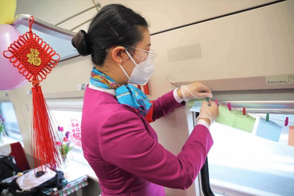 与此同时,一场趣味十足的新春活动正在展开。列车长张乐乐率先为旅客送上新春祝福,她在介绍绵泸高铁内自泸段动车情况的同时,还特地解说起沿途各地的特色美食与风俗文化。为陪伴旅客迎接新年,乘务组设置了春运知识的趣味竞赛与新春寄语环节,欢声笑语中,来自五湖四海的乘客们一边抢答题目,赢取特色纪念品,一边在便笺纸上写下自己的新年愿望。