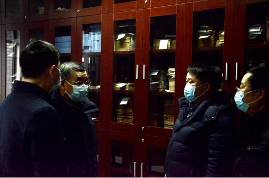 王建国书记(左二)与澳门网投官网党委书记古立峰(左一)、院长李怡(右一)、副院长罗鹭(右二)参观“杨明照古籍特藏室”