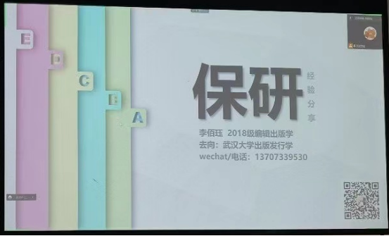 在新闻传播专场分享中,另有八位同学分享了自己的保研经验。周祺蕙同学以“保研攻略”的方式生动有趣地向同学们展示了自己的保研历程,就院校选择、专业选择等问题给出了自己的见解,鼓励同学们与焦虑和解,拒绝恶性竞争。尹梦奇、李萌、徐紫菱三位同学则就保研细则、保研流程、各院校特色给出了自己的见解。梁昊晨同学保研至中国人民大学新闻学专业,他在前面几位同学分享的基础上,以“做自己”为主题舒缓了同学们面对保研的焦虑心态。为什么需要硕士学位?为什么要做自己?如何找到自己?梁昊晨同学借这几个问题建议同学们要思虑清楚再做选择,“他强任他强,清风拂山岗”,不要一味地“内卷”。保送至中山大学的易思思同学从自己踩过的“坑”讲起,为大家指出面临困难时应如何解决。从汉语言文学跨保到本校网络与新媒体的王雨枫同学则分享了诸多“干货”,保研路上遇到过的所有压力与困难、专业课复习与面试的指南,她都一一为同学们列出。最后,王雨枫同学回望自己的保研经历,总结经验,希望同学们平和看待保研,不要关心“社会的标准”,而是去关心自己做了什么。保送至武汉大学的李佰珏同学也通过线上共享PPT介绍了自己的基本情况,留下了联系方式方便学弟学妹们联系。