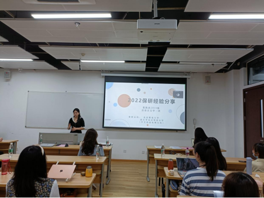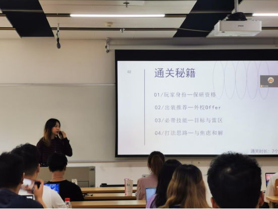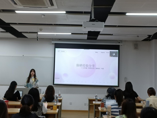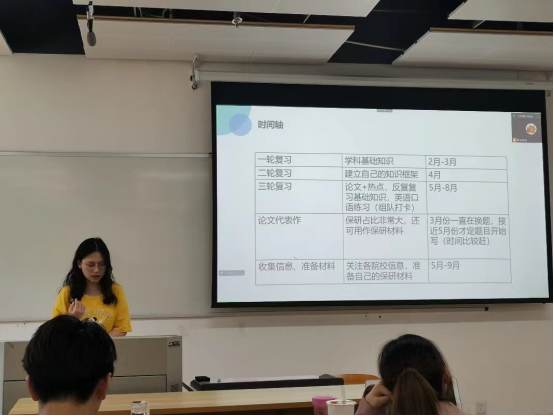 随后,经验分享环节正式开始。首先是中文专场,莫凯洁同学作为第一位分享同学从“知道保研是什么”“在保研中做了什么”两个问题开启了本次分享会之旅,她按照“三步走”的策略阐述了“目标确定”“步骤分明”和“行动办法”。牛童同学讲述了自己从国际知名暑校到成功保研的多彩经历,尤其是将出国留学准备工作和国内保研准备工作融合在一起,为同学们提供了针对性的借鉴经验。崔逸灵同学以“普通人保研指南”为题,生动形象地为面临保研焦虑的同学“开处方”“避禁忌”。向宇歌同学和王一丹同学分别用时间轴的方式展示了自己保研过程中的具体安排,为大家梳理了更加清晰的时间管理步骤,并介绍了部分学校的夏令营时间安排和部分公开的面试流程。赵嘉宁同学则先是讲述了自己在保研路上曲折但激励人心的故事,后又无私分享给大家详细的资源清单。彭笑秋同学以录制视频的方式为大家分享保研路上的几个关键步骤“发现兴趣-收集信息-明确定位-供需对接”的心得,十七分钟的视频充满干货。