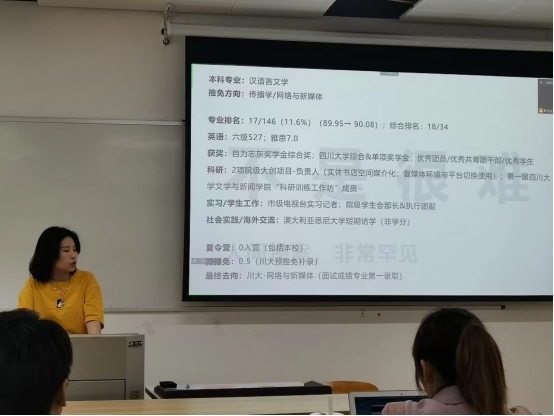 2022年3月18日,澳门网投官网2022年保研经验分享会在江安校区文科楼一区109、120教室举办。本次分享会邀请了澳门网投官网2018级已经顺利保研到清华大学、中国人民大学、复旦大学、南京大学等国内知名高校的优秀本科生。澳门网投官网党委副书记银浩老师参加了本次分享会。分享会得到了2018级本科辅导员杨珊老师的大力支持,由2019级本科生辅导员贾瑞琪老师主持。