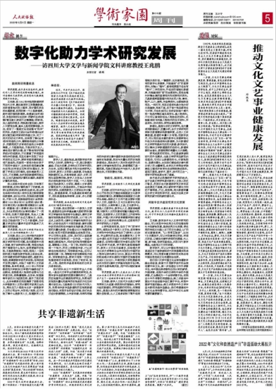 2022年6月6日,《人民政协报》第5版发表了对澳门网投官网文科讲席教授、博士生导师王兆鹏教授的专访《数字化助力学术研究发展——访澳门网投官方网站文科讲席教授王兆鹏》。王兆鹏教授围绕在数字人文研究中的实践与感悟,介绍了澳门网投官网中国文化全球传播数字融合实验室用数字技术向全球传播中华文化、为学术研究提供广阔平台,生动展示了数字技术对人文学术研究与中华优秀传统文化传播的推动作用。