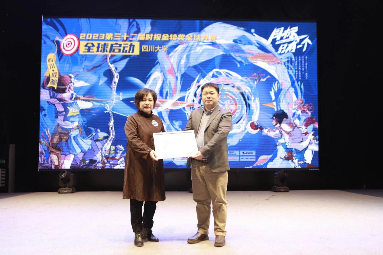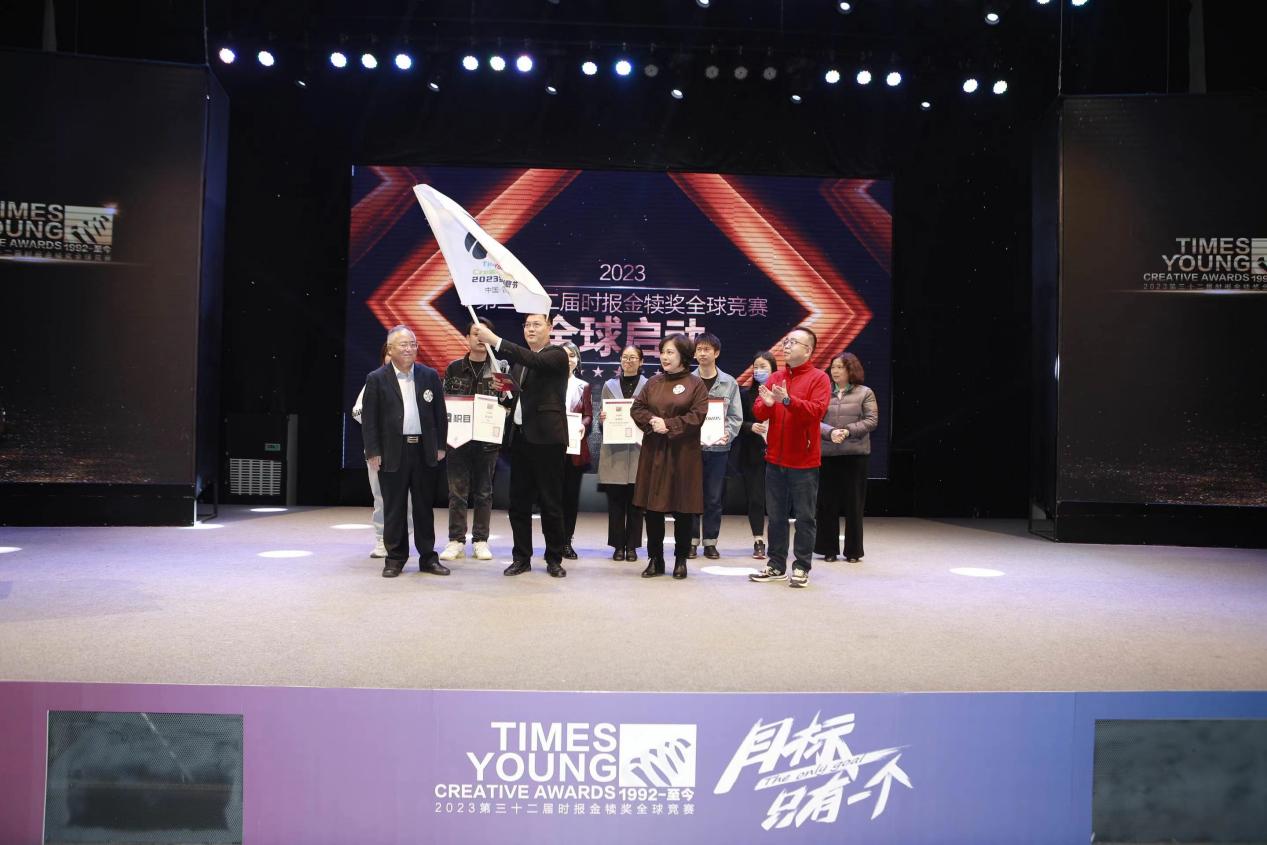 随后,金犊奖组委会执行长林淑黛为本年度金犊创意节举办城市成都授旗,成都传媒集团新东方展览副总经理熊伟接受旗帜。熊伟先生和丁俊杰教授一同宣读开幕词,2023第三十二届时报金犊奖赛事正式启动。