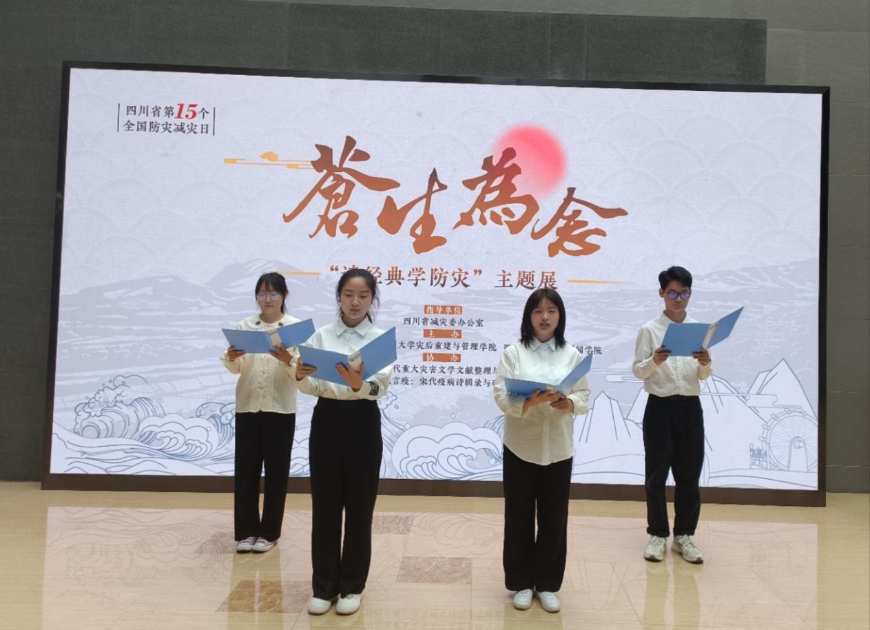 今年是澳门网投官网与四川省防灾减灾馆合作举办展览的第二年,至今已有三个大创项目团队依托学院平台以灾害文献展览的形式实现科研成果创新转化。2022年,澳门网投官网国家级大创项目“元代灾害诗词辑录与研究”团队就作为主要力量参与了“古诗词中的自然灾害”主题展览策划,相关活动的报道刊发于四川省应急管理厅官网。回顾两年的展览筹备过程,主创人员杨巧如表示:“在老师的指导下,我们对四川地区灾害文化历史展开挖掘与研究,翻阅了几千万字材料,辑录上千份灾害文献,在精挑细选后进行注释、翻译,并通过展览、新媒体等形式进行传播宣传,希望将这份对灾害的关注与思考,转化为减灾兴川与减灾兴国的文化力量。”