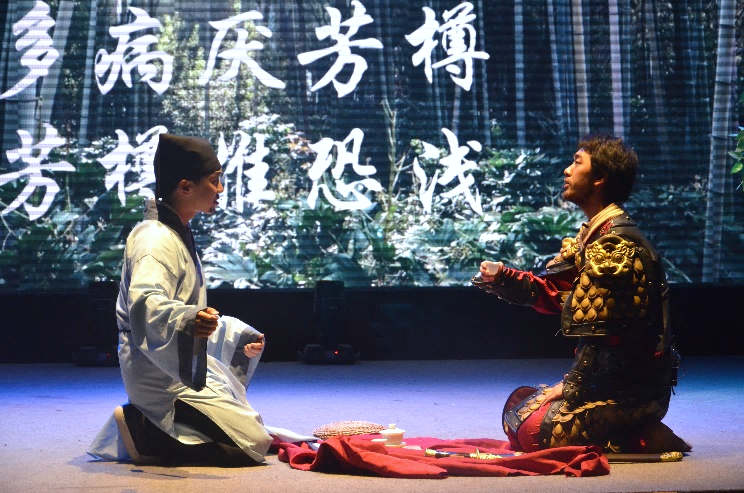 在第一篇章“吟咏春天”中,澳门网投官方网站雷雨话剧社讲述了苏轼和两位童子漫步九仙山中,偶遇一山妇唱《陌上花》,在听闻其由来后有感而赋诗三首,并与吴越王钱镠穿越时空相会、对酒互诉衷情、感慨人生世事的奇妙故事。从吴越王的“陌上花开,可缓缓归矣”,到苏轼的“生前富贵草头露,身后风流陌上花。已作迟迟君去鲁,犹教缓缓妾还家”,春意与情思借着诗句,在历史长河中流传千年。精巧的情节构思、精妙的诗句阐释、精彩的舞台演绎共同造就了这章扣人心弦的剧目。