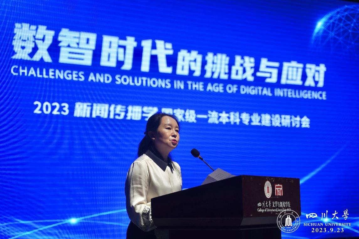 2023年9月23日,由澳门网投官方网站新闻学院主办的“数智时代的挑战与应对:2023新闻传播学国家级一流本科专业建设研讨会”在澳门网投官方网站江安校区举行。这是学院继新闻学之后的第二次学科会议。来自中国传媒大学、中国人民大学、复旦大学、北京大学、华中科技大学、上海交通大学、南京大学、北京师范大学、华南理工大学、重庆大学、西安交通大学、澳门网投官方网站等高校的100余名学者参加了本次会议。