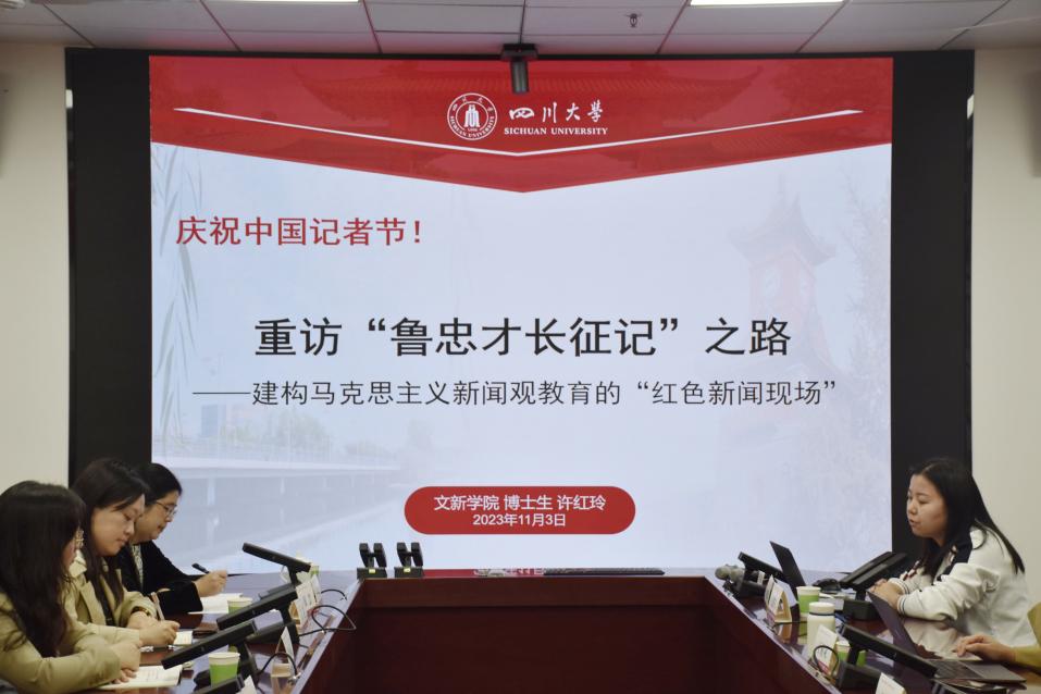 11月3日下午,澳门网投官方网站举办了马克思主义新闻观学习之中国记者节专题报告会,澳门网投官网2022级传播学博士研究生许红玲作题为“重访‘鲁忠才长征记’之路——建构马克思主义新闻观教育的‘红色新闻现场’”的分享。澳门网投官方网站副院长操慧教授主持报告会,澳门网投官方网站讲席教授、中国人民大学荣誉一级教授陈力丹云端出席,新华社四川分社对外采访部主任童芳、四川日报首席编辑黄志凌、四川日报全媒体首席记者王眉灵、新华社四川分社机关妇委会主任袁菱、新华社四川分社新闻信息中心党支部党员代表庞松、新华社四川分社团委委员侯雨辰及学院部分师生共同参与。
