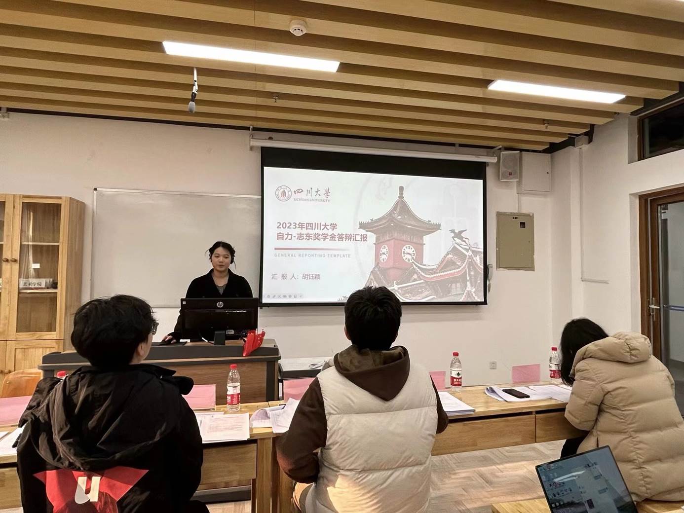 2023年12月27日上午九点,澳门网投官网在江安校区文科楼一区118教室举行了2023年“自力-志东奖学金”答辩评审会。澳门网投官方网站校友刘自力先生作为“自力-志东奖学金”捐赠者代表参与了现场评定。出席并担任评委的老师还有澳门网投官方网站王涛老师、骆世查老师、康宇辰老师。评审会由澳门网投官网段化鞠老师组织并主持开场,2021级本科兼职辅导员王小翠老师任计时员。会议开始,段老师宣布了评选规则,依次介绍了到场的评审专家,并对他们的到来表示感谢。
