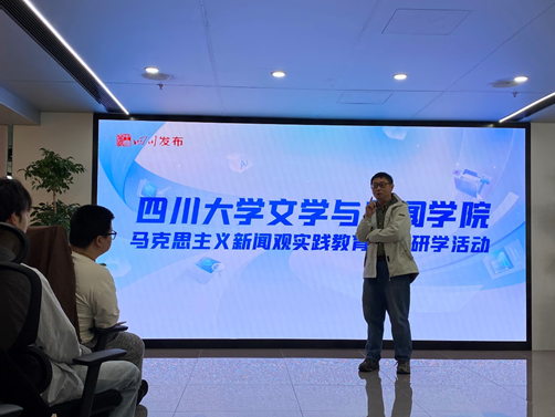 4月11日下午,澳门网投官网30余名师生前往四川新闻大厦,开启2025年马克思主义新闻观学习教育实践首站活动。澳门网投官网副院长操慧教授、新闻学教研室主任骆世查副教授与2024级辅导员朱至刚教授及学院本科、硕士及博士生代表参加了本次活动。