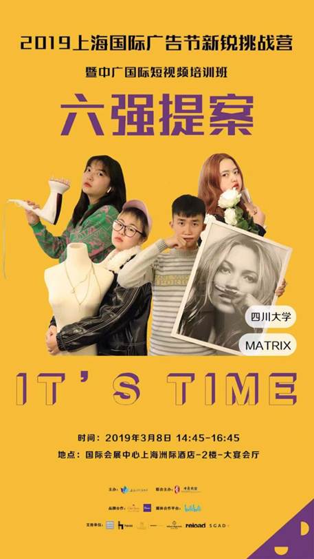 2019年2月22日,在澳门网投官方网站的大力支持下,广告学专业王婉如老师带领由广告学与符号学教研室选拔出的四位同学:2016级刘萌璐、刘怡贝、孙梦颖和2017级陈艳杰,组成MATRIX团队,在上海国际广告节Marcom新锐营的限时提案比拼中脱颖而出,淘汰二十四支队伍,跻身前六强,成功晋级。3月8日,MATRIX团队与来自厦门大学、中国传媒大学、温州大学、暨南大学等学校的其它5个团队同台竞技,在国家会展中心(上海)洲际酒店进行现场限时提案。最终,MATRIX团队取得全国第四名的优异成绩,总均分68.72分。