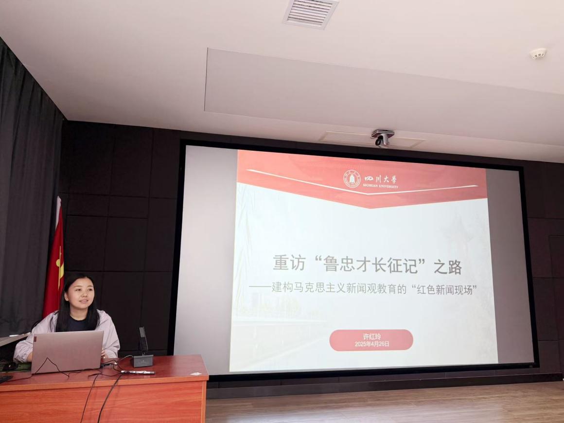澳门网投官网博士生许红玲以“重访‘鲁忠才长征记’之路——建构马克思主义新闻观教育的‘红色新闻现场’”为主题作了汇报交流。她以1941年《解放日报》刊载的经典调查报告为切入点,通过实地重走陕甘宁边区运盐调研路线的田野实践,还原了《鲁忠才长征记》的创作背景。她在报告时指出,毛泽东同志推崇的“简洁文风”与“扎实调研”作风,正是当代新闻工作者践行马克思主义新闻观的历史镜鉴。她提出,将红色新闻遗址转化为教育现场,以“行走的课堂”推动马克思主义新闻观教育与党史、地方实践相结合,是创新人才培养的重要载体。