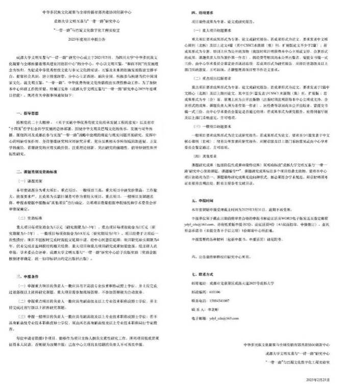 协同创新中心简报总第373期 |成都大学文明互鉴与“一带一路”研究分中心、“一带一路”与巴蜀文化数字化工程实验室2025年度项目申报公告