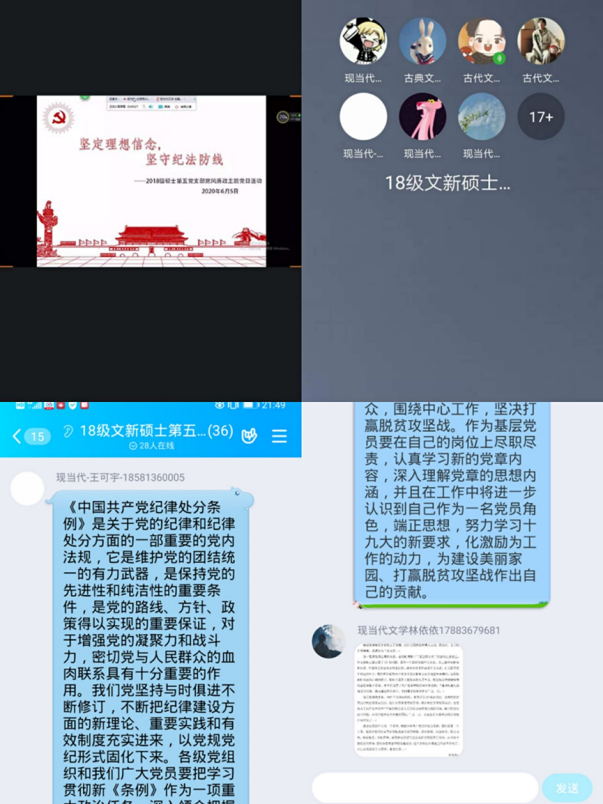 2018级硕士第四支部开展“党风廉政教育宣传月”线上组织生活会活动,支部22名党员全部参与。组织生活会前党支部上传了学习文件,通过致敬抗“疫”先进事迹和典型人物,开展了党内法规专题学习会,每位党员结合身边防控疫情的具体事迹踊跃发言,围绕着严明党规党纪的意义进行积极探讨。会议第二项针对“党风廉政教育宣传月”的主题展开。支部成员认真学习了习近平总书记在十九届中央纪委四次全会上的重要讲精神,针对党的十八大以来反腐倡廉工作中典型案例的学习,从中领会时刻铭记党的纪律性的重要性、必要性。