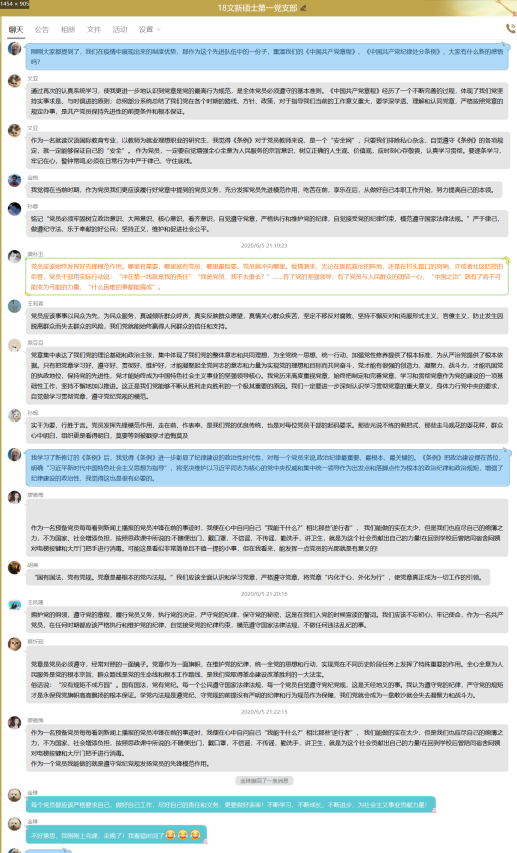 2018级文新硕士第六党支部组织召开了围绕疫情防控开展爱国主义教育的线上讨论会,2018级文新硕士第六党支部全体党员在微信群中踊跃发言、积极讨论。线上讨论会中每位成员都参与了发言,他们表达了对在抗疫一线的医护人员的致敬和对党和国家的深深热爱,并表示,应该发挥党员带头先锋模范作用,牢记使命,不忘初心,践行自己的诺言。