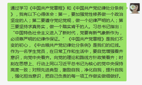 通过学习,2018级研究生党员深切认识到党纪党规的重要性,大家一致认为,党章是共产党人的行动准绳,更是立党之本,行动之规,对照之镜,执纪之尺,护党之宝,廉风建设和从严治党的关键就在于以党章作为对照标准,让每个党员明确职责,不越党内法规制度的黄线,以实际行动为实现中华民族伟大复兴的中国梦而作出应有的贡献。