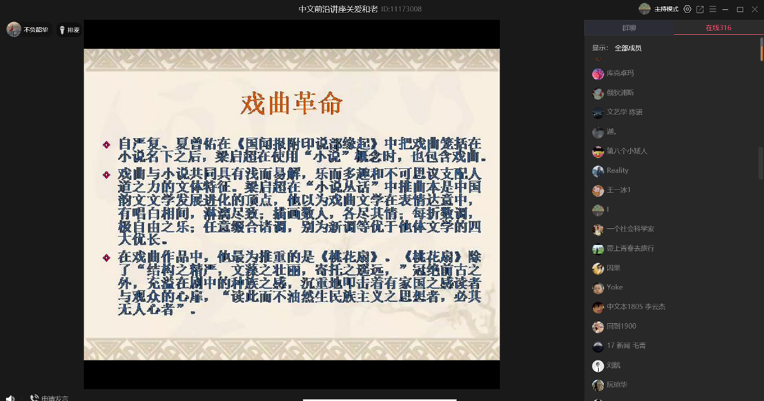 关老师讲了梁启超的生平、思想以及梁启超与文学界革命的关系,还有梁启超的读书时期、参与维新、回国参政和著述讲学等经历。梁启超不仅在护国运动中为维护共和起到了重要作用,也对维新变法和五四爱国运动做出贡献。通过此次讲座,我们初步了解了梁启超的生平和他对文学革命的作用。这次讲座采取了QQ群课堂的形式。参加讲座的老师和同学来自不同地方,这场“云端锦江”讲座将来自全国各地的师生连接在一起。疫情期间,很感谢学院努力为大家创建的学术环境,在线上听学术讲座的方式十分便捷,跨越了地域局限。