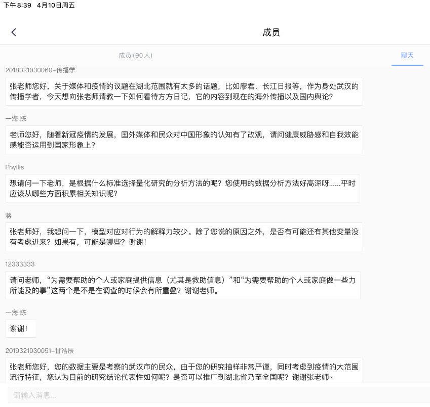 张明新教授以回溯的方式,向在线师生展示了一个实证量化研究从想法到选题,从思考到操作的完整过程,并在讲解中补充了偏相关分析、路径分析等统计方法上的知识。通过扎实的数据与严谨的设计、分析,张明新教授总结了相关研究发现与结论,这其中既包括“微信、互联网和电视是疫情期间公众使用最多的媒体”等描述性统计结果,又有“媒体使用因素显著提高了公众健康威胁的感知”和“公众对疫情信息的加工思考显著提高了公众的自我效能感”等主要结论。