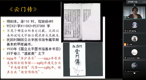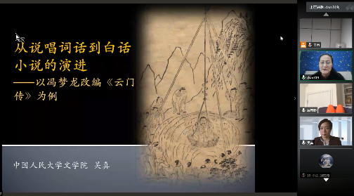 2020年10月15日下午3:30,中国人民大学文学院吴真教授应邀作题为“从说唱词话到白话小说的演进——以冯梦龙改编《云门传》为例”的在线主题讲座。澳门网投官网丁淑梅教授任讲座主持人,学院内外300余名师生在线参与。