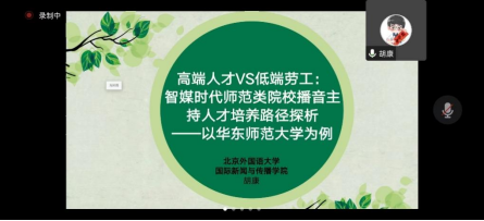 北京外国语大学博士研究生胡康以华东师范大学为例,作了题为《高端人才VS低端劳工:智媒时代师范类院校播音主持人才培养路径探析》的发言。他立足“赛博格”时代,探索播音主持专业人才展示操练的现实路径,提出综合类院校播音主持需要紧跟媒介发展趋势,力求培养具备中国特色的专业化语言传播、口语传播高端人才。