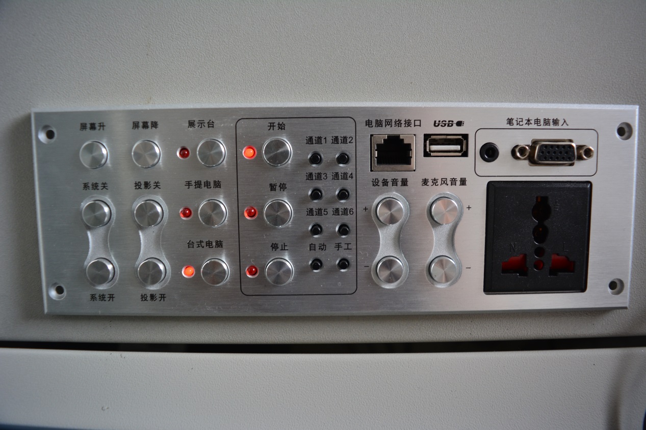 注:投影开关需要用遥控器控制,遥控器放在多媒体设备控制台上。
