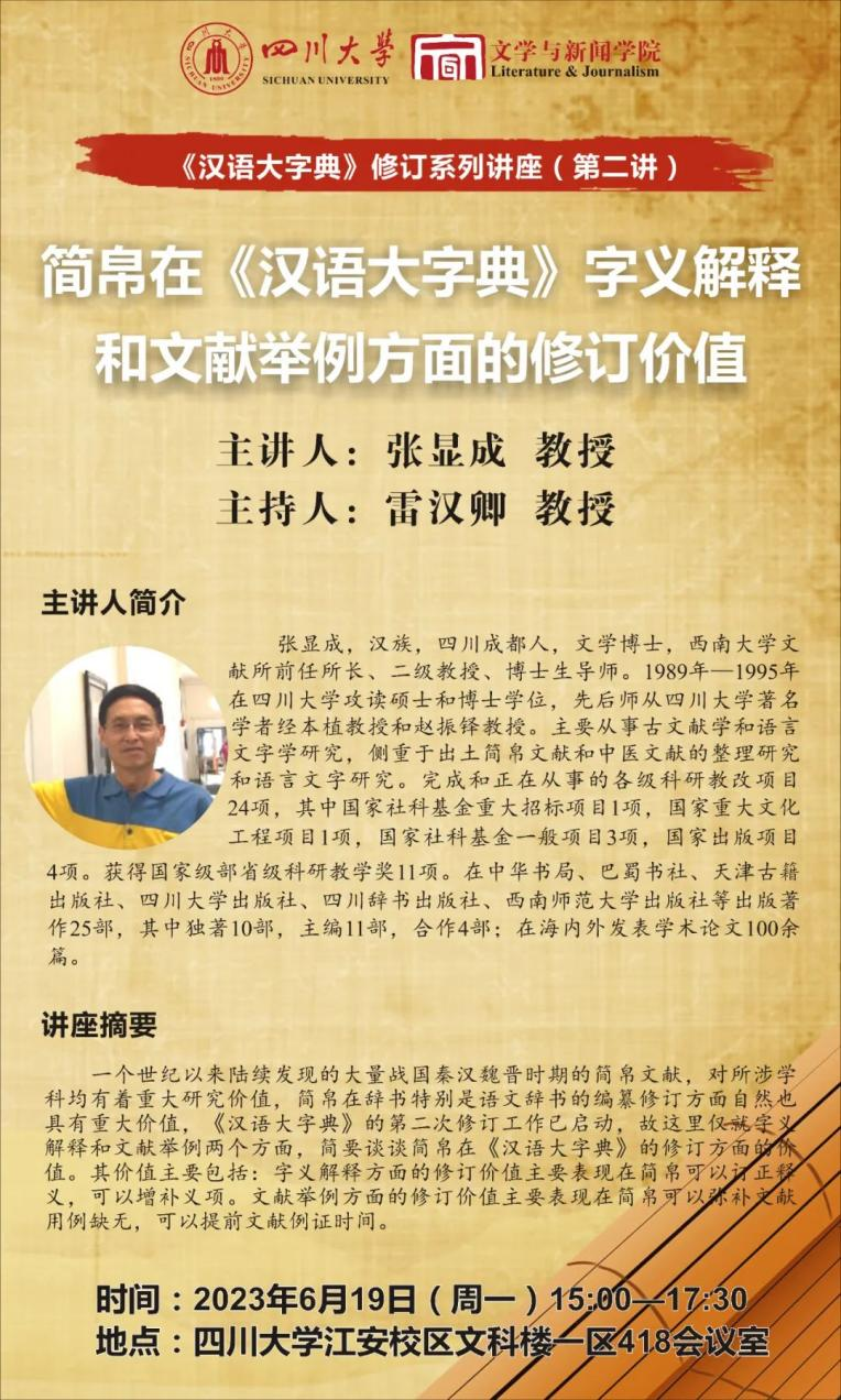 《汉语大字典》修订系列讲座(第二讲)于2023年6月19日下午15:00至17:30在澳门网投官方网站江安校区文科楼一区526会议室开展。西南大学博士生导师张显成教授作了题为“简帛在《汉语大字典》字义解释和文献举例方面的修订价值”的讲座。澳门网投官方网站雷汉卿教授担任主持人。