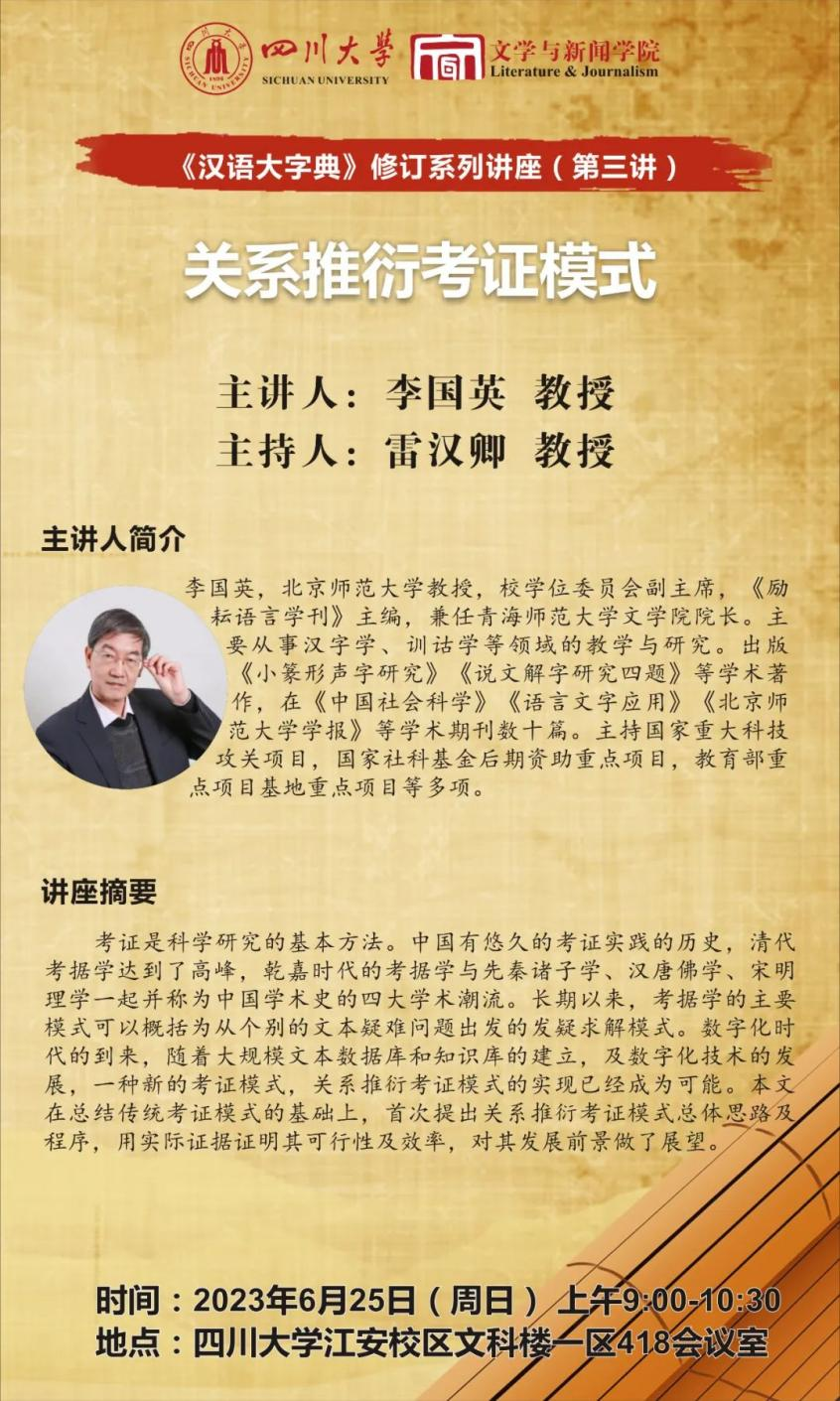《汉语大字典》修订系列讲座(第三讲)将于2023年6月25日上午9:00至10:30在澳门网投官方网站江安校区文科楼一区418会议室开展。北京师范大学教授、校学位委员会副主席李国英教授作为主讲人将作题为“关系推演考证模式”的讲座。澳门网投官方网站雷汉卿教授担任主持人。