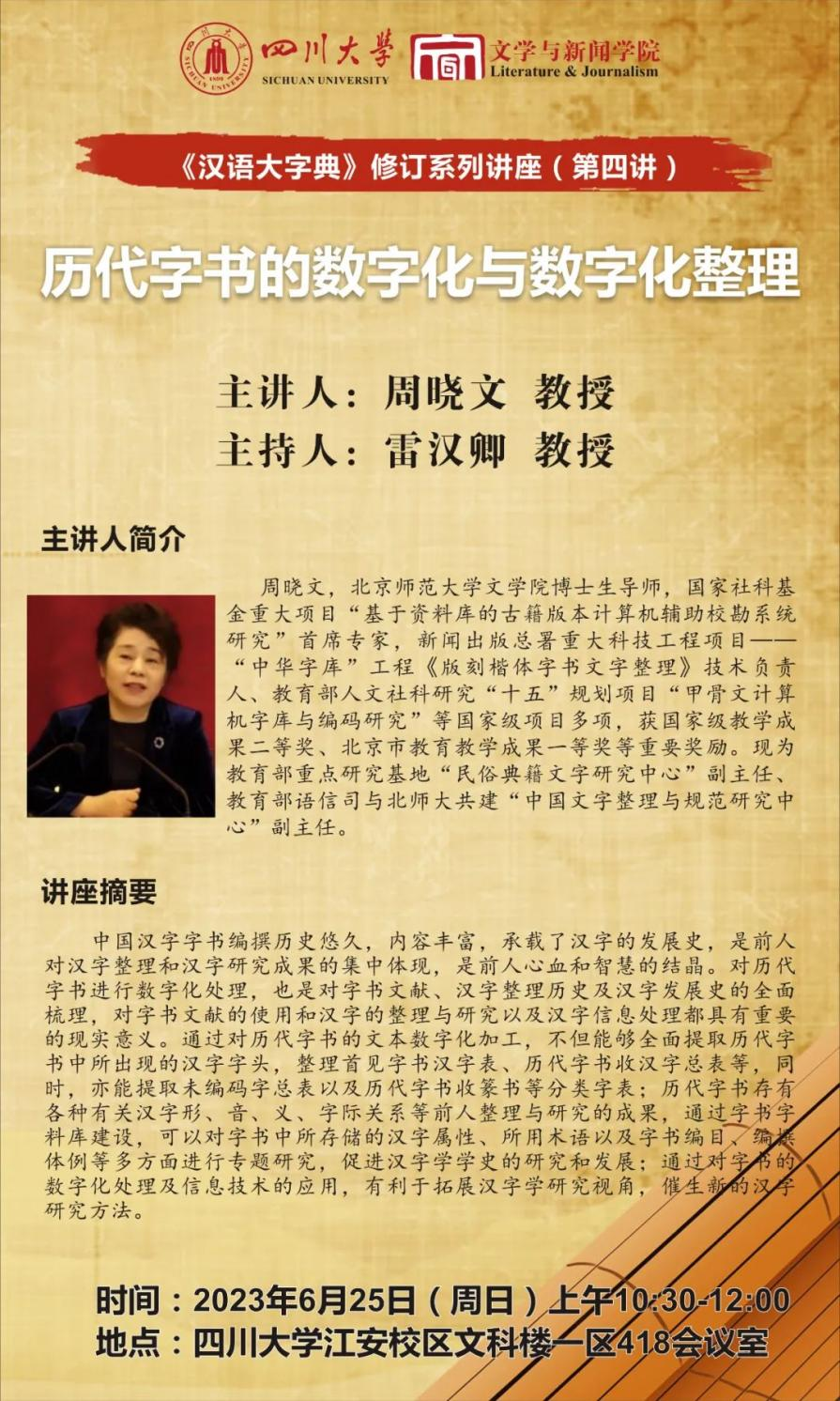 《汉语大字典》修订系列讲座(第四讲)将于2023年6月25日上午10:30至12:00在澳门网投官方网站江安校区文科楼一区418会议室开展。北京师范大学文学院博士生导师周晓文教授将作题为“历代字书的数字化与数字化整理”的讲座。澳门网投官方网站雷汉卿教授担任主持人。